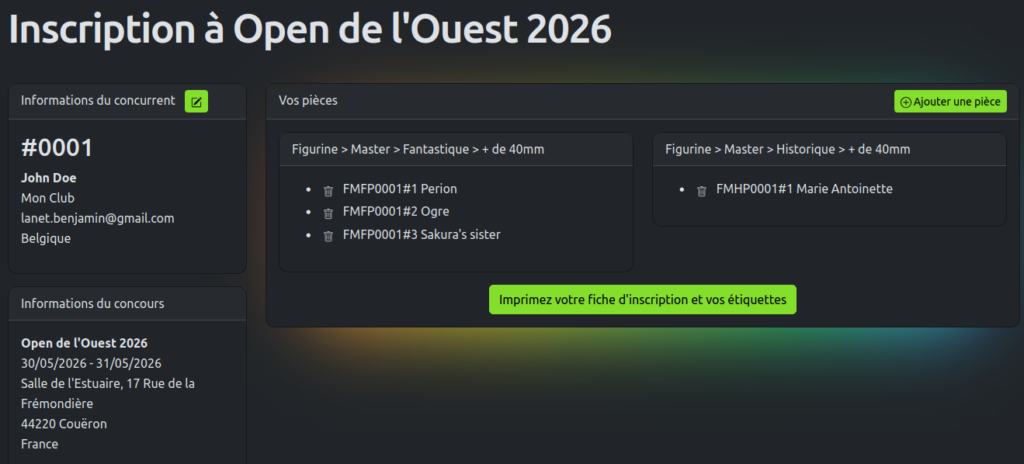 Une fois toutes vos pièces dans l’outil vous aurez la possibilité de préparer tous les éléments du concours via le bouton « Imprimez votre fiche d’inscription et vos étiquettes »