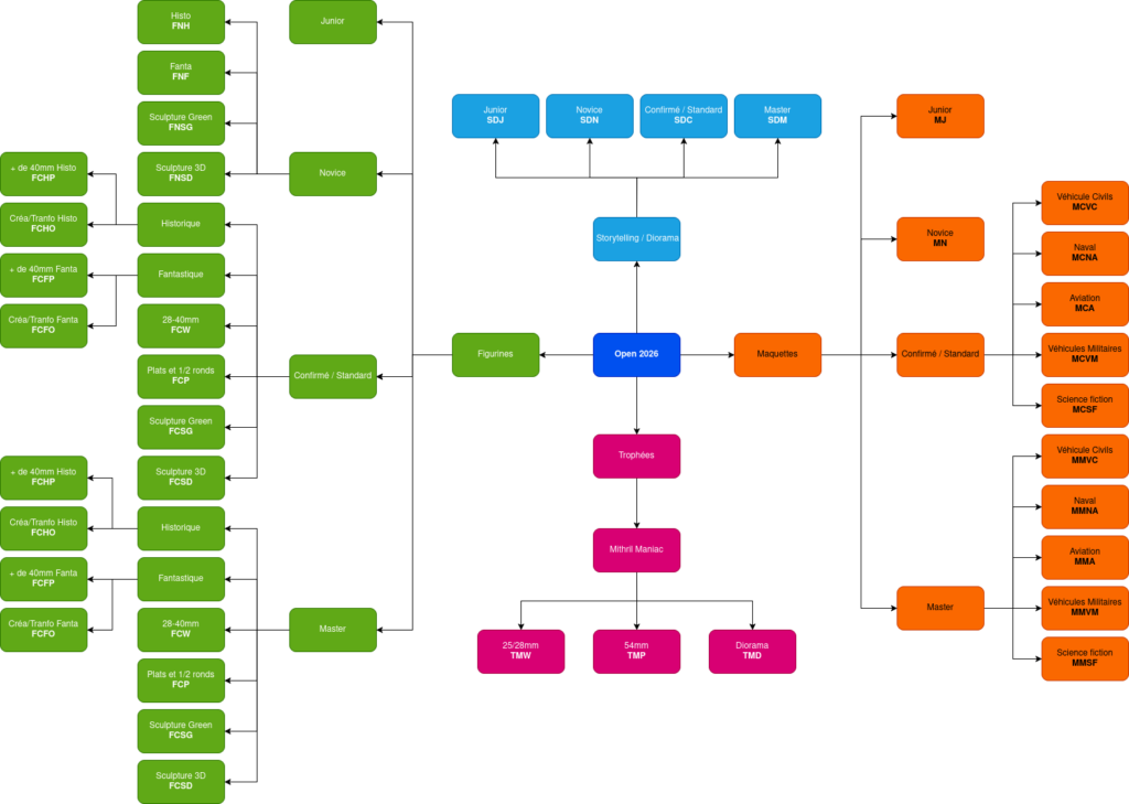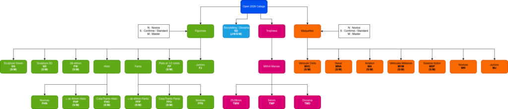 - Novices : Ce niveau est réservé aux concurrents novices n’ayant pas remporté de médaille d’or dans ce niveau. Les novices auront exclusivement des catégories historique et fantastique.